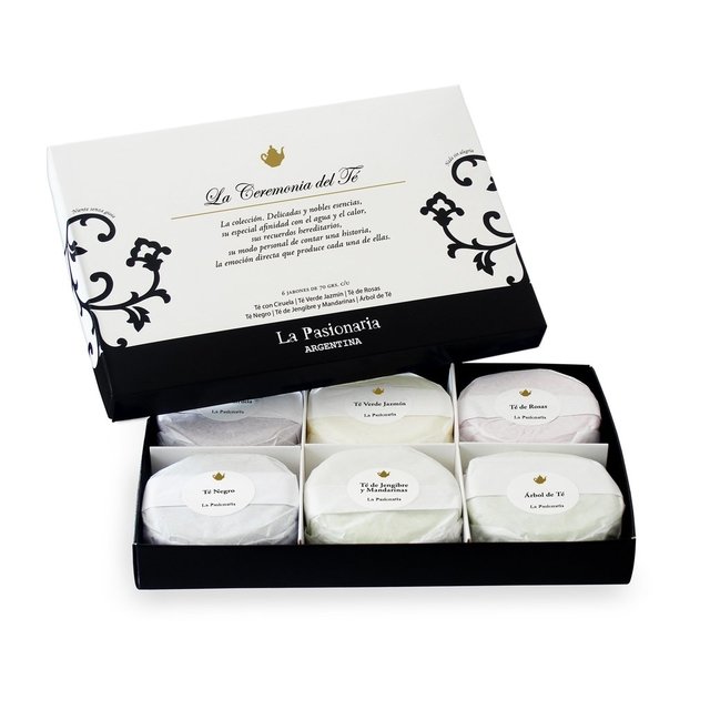 Estuche de 6 jabones de 70 grs c/u. Colección: Té con Ciruela, Té Verde Jazmín, Té de Rosas, Té Negro, Té de Jengibre y Mandarinas, Árbol de Té.
